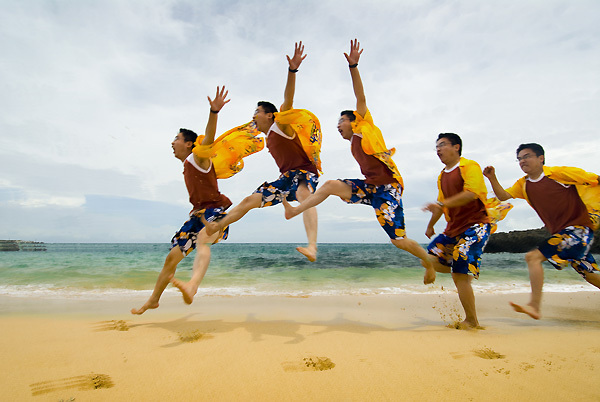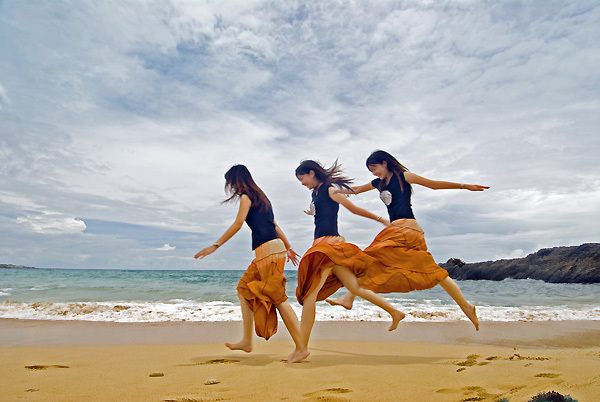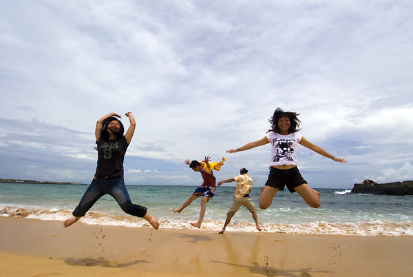 背景是湛藍的天空勾勒上一抹淺雲,我們為了拍照,頂著艷陽在岩石上爬上爬下,再發燙的岩塊、刺眼的反光板,也在踏入沁涼的海水那一剎那一筆勾消!我們就這麼一會兒拍照,熱了就躲到岩石邊的陰涼處休息,收工後再到大骨麵店報到,準備下午的浮潛啦!