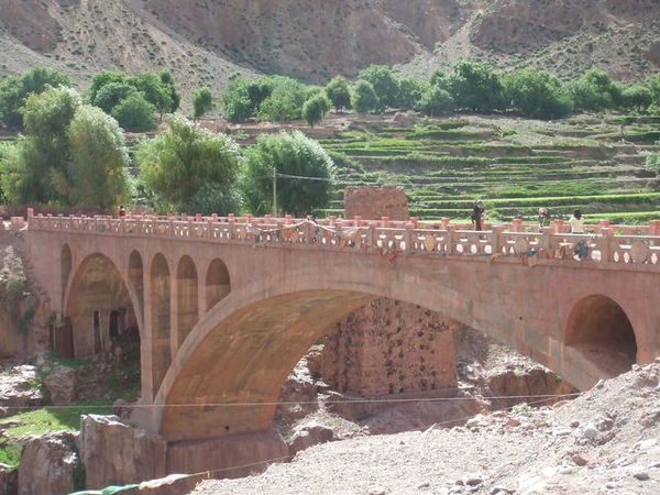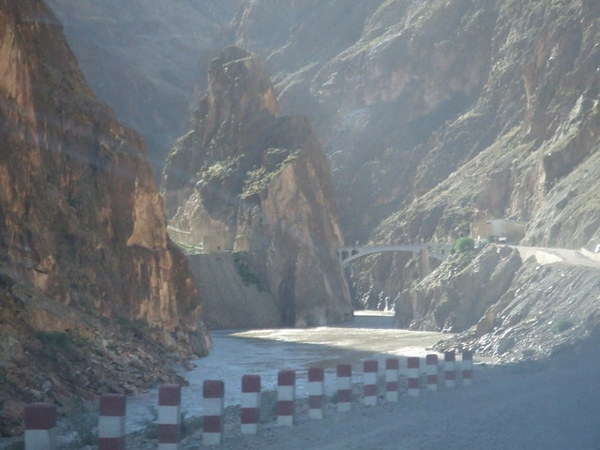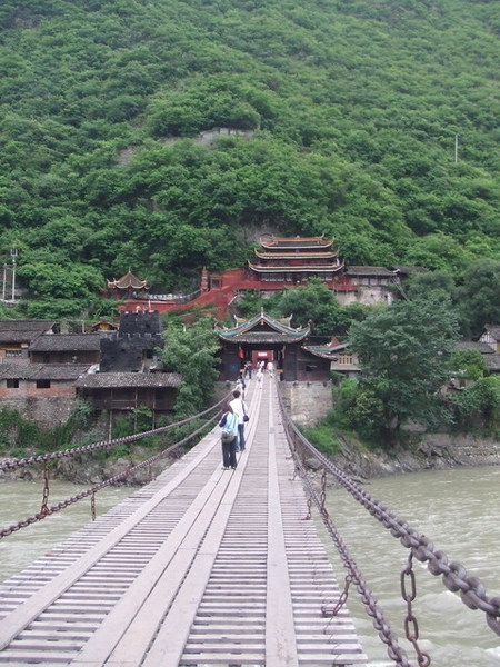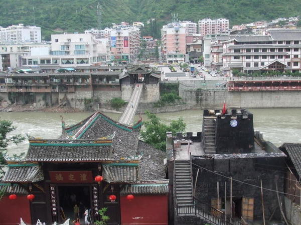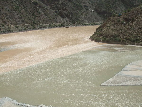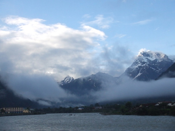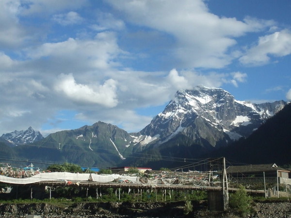在飯店的自助吧繞了一圈,我們決定去外頭覓食。走出飯店大門,過橋,走了十幾分鐘到了大馬路邊,卻找不到一間早餐店,轉入一條小巷後才看見一家餅店,我們買了蔥花餅跟麻花卷,一路啃回飯店,在橋上拍下了第一眼的布達拉宮。