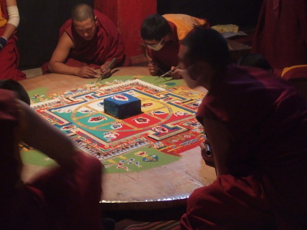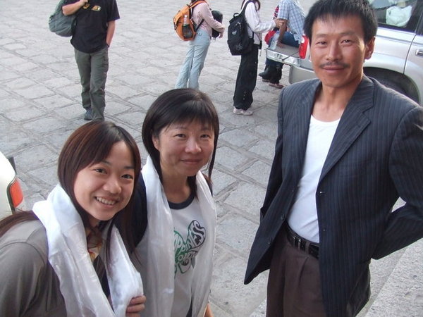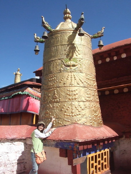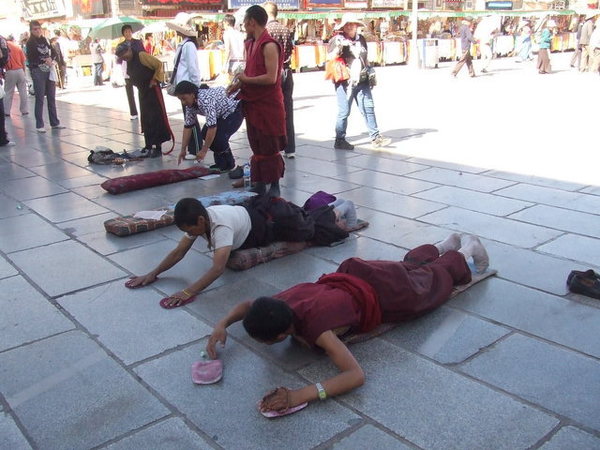 今天有一位劉先生當我們的導遊,他先帶我們來到大昭寺。九點多的大昭寺廣場已經被參拜、磕頭的藏人及旅客填滿。進入大昭寺不可戴帽子、墨鏡,也不可以拍照,大昭寺內摩肩接踵,我們只能努力跟上劉先生的腳步,豎起耳朵捕捉在眾多人聲雜遝中劉先生悠遠卻豐富的音軌。搖曳的燈影、酥油特有的香氣、放滿各國紙鈔的神龕、被薰黑的雕刻,喇嘛、藏人與遊客勾勒出特殊的氛圍,在經過文成公主像與釋迦牟尼十二歲等身像,也許處於宗教聖地,亦雙手合十虔誠地祈求保佑。
