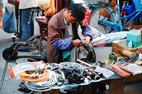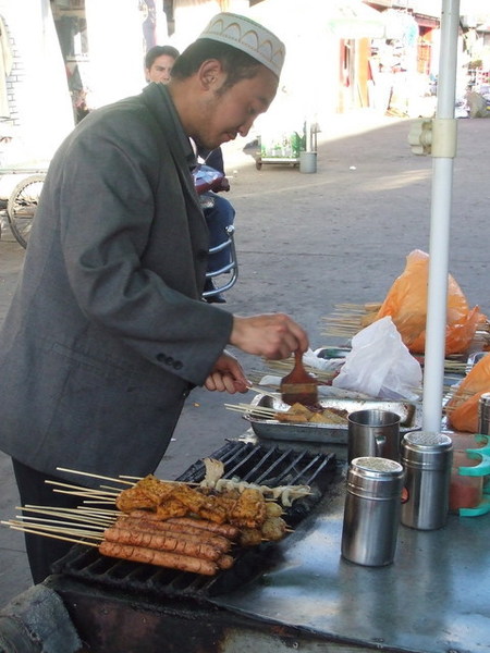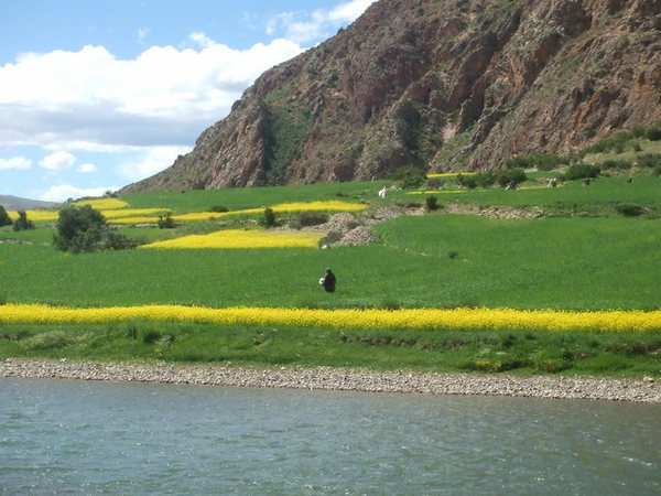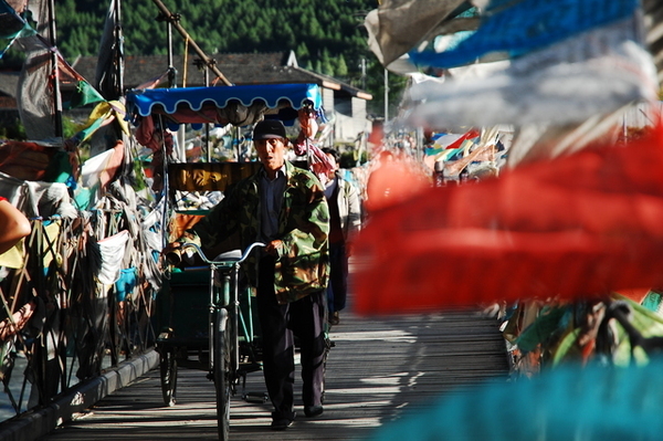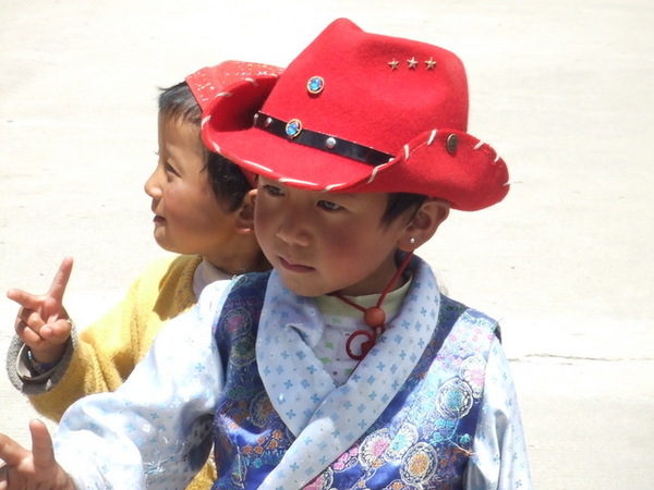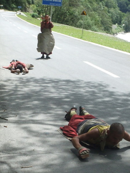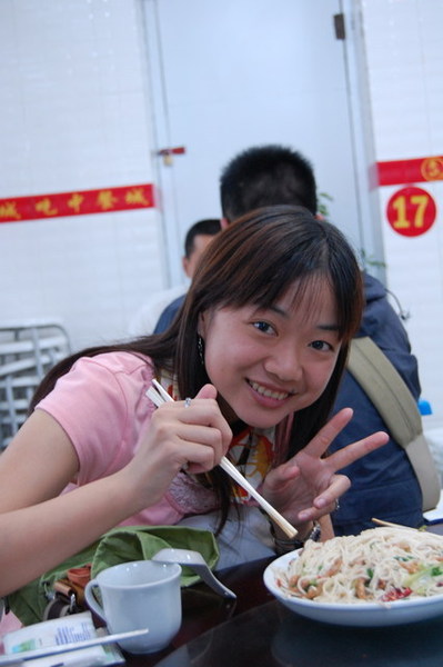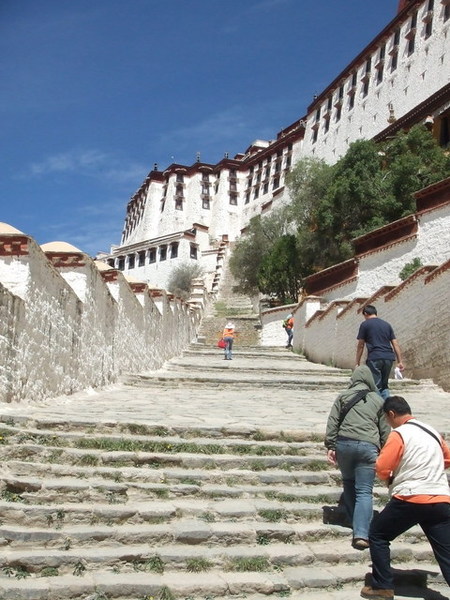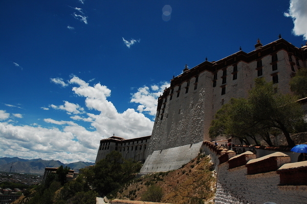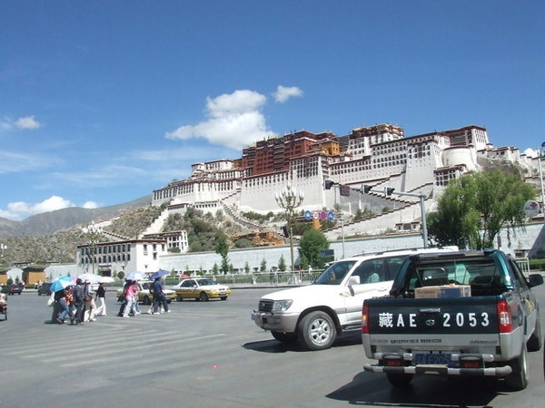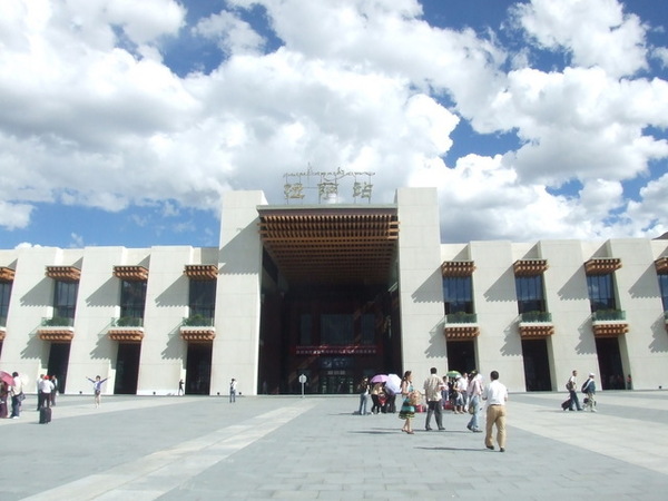 當車子緩緩駛近布達拉宮,我才驚訝地發現:原來布達拉宮就在大馬路邊,而對面就是百貨公司!我一直認為布達拉宮高高在上,沒想到如此貼近民眾,果真是都市來的土包子。我們將近十二點進入布達拉宮的側門,不但要準備台胞證,還要通過安檢,仰望布達拉宮更是壯觀,當我們開始殺底片時卻接到一個惡耗:我們要在12點20分前爬上聽說是一千多個階梯抵達白宮門口,以我們爬觀魚亭的速度(1200階爬了兩個小時)怎麼可能呢?果然人的潛力是無窮的,布達拉宮緣山而建,我們相當於在三千多公尺的高度爬山,但是邊爬邊拍照的情況下,竟然也讓我們在指定的時間內到達入口,真是可喜可賀!(還是可歌可泣?) 拿著門票進入白宮之前,看到一群人在廣場上拿著一跟木棍,底下接著一塊木板,一邊敲打地面一邊唱歌,以前是勞動兼娛樂,現在則成為一個表演。進入布達拉宮內部後,我們只有一個小時的時間要看完白宮與紅宮,若沒有在一個小時內出來,劉先生還會被處以為數不小的罰款。白宮是執政中心,印象比較深刻的是紅宮。紅宮內放置了歷代達賴喇嘛的靈塔,每一座靈塔都是珠光寶氣,尤其是達賴五世及十一世的靈塔非常高,仰望高聳、以黃金打造且鑲滿寶石的白塔,實在很難想像這是一座墳墓。達賴們打造靈塔的黃金都是以「千斤」來計算的,但是劉先生說了一句讓我印象深刻的話:「黃金是布達拉宮裡最不值錢的東西。」相較於排滿整面牆壁的經書、歷史久遠而斑駁的壁畫、達賴們的靈塔、等身像、衣冠塚,黃金真的是一文不值。 從白宮出來後,終於可以慢慢走、慢慢拍,但陽光實在螫人,我們盡情拍照之後,在布達拉宮旁的餐館吃飯,但大家都熱得吃不下,飲料倒是喝掉了不少。吃過飯後,頂著大太陽我們往哲蚌寺前進。哲蚌寺比較符合我想像中的寺廟,在市郊的山上,因為是喇嘛們學習的地方,所以遊客較少,可以讓我們盡情遊覽。 輕撫被烈日螫傷的雙頰,我們為了一睹青藏鐵路的風采,來到拉薩火車站,正好有一班火車進站,遊客們從車站湧出,也在幾分鐘之內鳥獸散,只剩下我們幾個人搶著跟拉薩車站的招牌拍照。在回到八角街前,為了讓辛苦的師傅們賺點小費,我們去了藏藥的購物點,聽完介紹還很好心地說要幫我們看手相,說穿了也不過就是要推銷藏藥。阿貴老師還因為示意其他人不要購買而被趕出來,氣焰也太高了點吧! 回到八角街,我們找了間小館子吃晚餐,阿杏說紅油抄手很好吃,水餃也還不錯,我點的炒麵實在太多啦!吃完飯後,我跟阿杏先回飯店搶救我被曬傷的臉,果然在高原比較接近太陽,防曬方面還是要有萬全的準備!