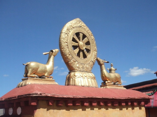 登上狹窄的樓梯來到二樓及三樓的平台,近距離接觸大昭寺的象徵:金輪與雙鹿,金碧輝煌的裝飾,以及遙遙相望的布達拉宮。紅牆、金瓦與帶著一絲絲白雲的藍天,好想就這樣坐著發呆,消磨一整天。但時間卻不允許,我們必須在指定的時間抵達布達拉宮,我只好在心裡暗自盤算自由活動時間再一次拜訪大昭寺。