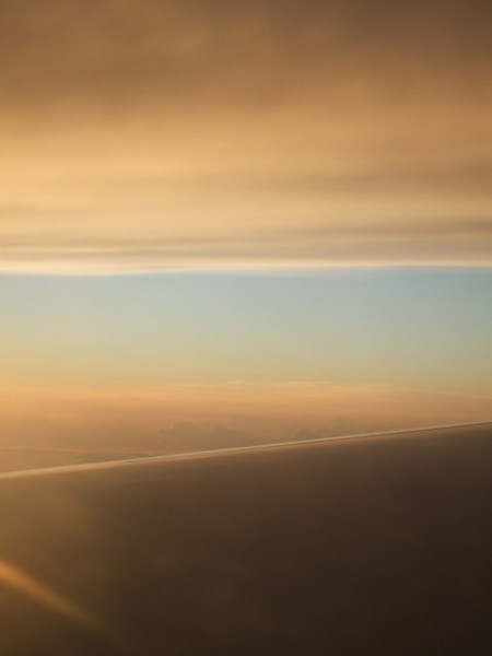 從香港飛到曼谷正值傍晚,從小小的窗子望出去的天空異常地迷幻,以白雲為外層,中間是一層藍天慢慢漸層到橘色的晚霞,而我們就在兩層雲之間飛行,直到光線完全隱沒,我們抵達華燈熠熠的曼谷。