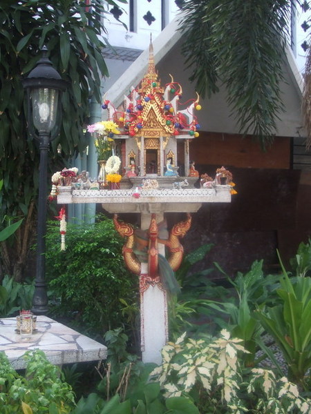 另外一個引起我注意的是,很多民宅或是公司行號外,都會有應該是供奉四面佛的神龕,或大或小、或簡陋或華麗,有些只有一座神龕,有些則有許多個加上眾多裝飾品。而從神龕大概就可以看出來這家人或是這間公司的經濟狀況如何了,而且很明顯愈往市區,神龕愈大愈華麗,看來這個神龕跟哈薩克人的墳墓有異曲同工之妙啊!