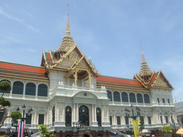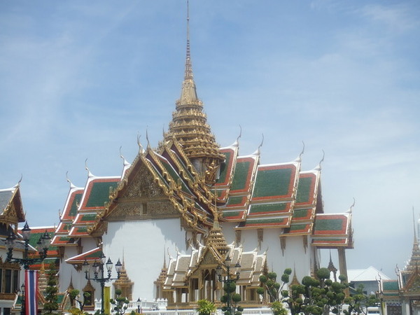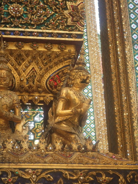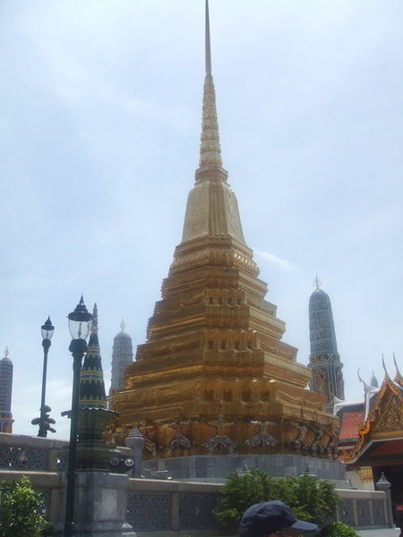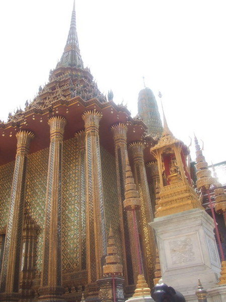 抵達大皇宮,從計程車上下來,又是一股蒸騰的熱氣,花了250泰銖買門票,可以參觀大皇宮及雲宮。從外觀就可以發現大皇宮氣度恢弘,青翠的的草皮更襯托出黃金尖塔的耀眼。進入大皇宮後,沒有想像中的大,建築與建築之間稍嫌狹窄。原本就已閃閃發亮的尖塔在陽光的照射之下更顯得金碧輝煌,若細看其裝飾就可以發現工匠首役之精巧,從階梯到雕像、從牆壁到屋頂,小至雕像的服飾,大至直指天庭的尖塔,無處不細膩,令人讚嘆。