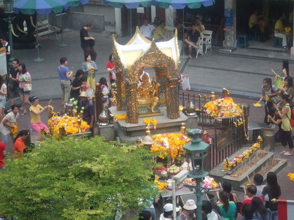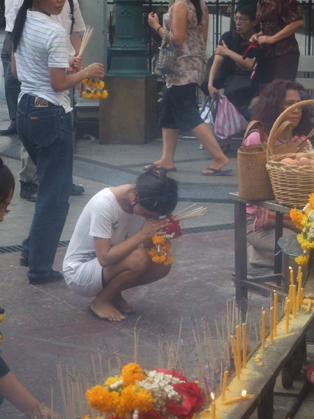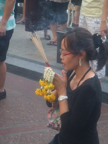 吐完之後,感覺精神又來了,找到了精油SPA,讓人家按摩真的滿舒服的,但出來後又吐了,幸好我有拿飛機上的嘔吐袋,不然就糗大了。因為頭痛到快裂開,於是決定去拜完四面佛就回去休息。四面佛果然香火鼎盛啊!遠遠就可以看到煙霧繚繞,而且我們在參拜時人潮從來沒少過。我買了20泰銖的香(姐買50泰珠的),總共有一束香、四個花圈加上一根蠟燭,我們依照書上的指示順時針拜拜,依序應該是事業、愛情、財運與健康,我先拜完之後,最後決定把蠟燭點在平安健康那一面,希望去西藏玩時平平安安囉!自己拜完就開始照相,觀察別人拜拜是件很有趣的事,看他們拜拜的方式、虔誠的臉龐、喃喃傾訴的雙脣,隨著裊裊上騰的煙慢慢蘙入了天聽。